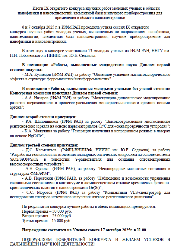 Итоги IX открытого конкурса научных работ молодых ученых в области нанофизики и нанотехнологий, элементной базы и научного приборостроения для применения в области наноэлектроники