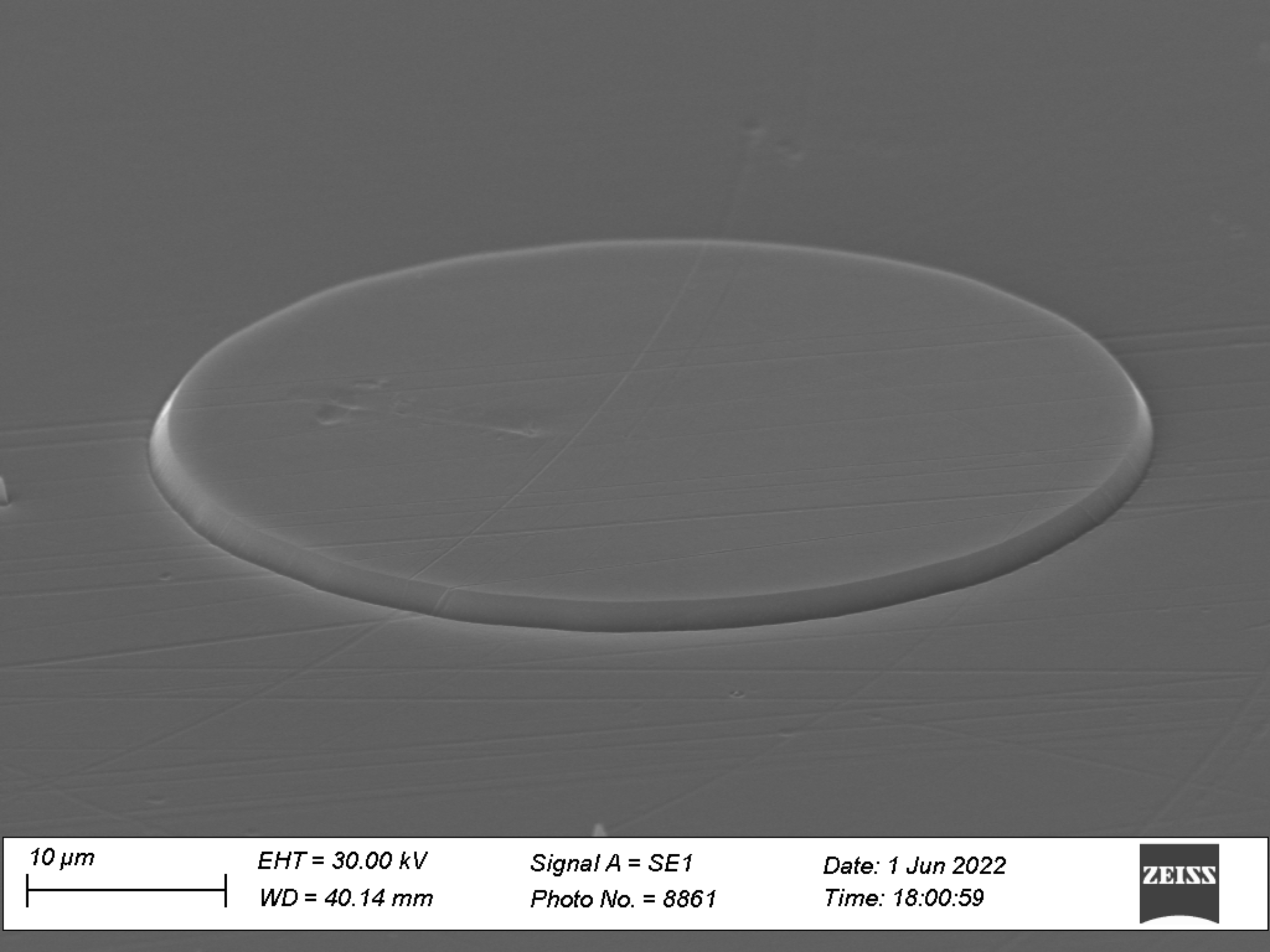 а) Изображение сканирующего электронного микроскопа исследуемого микродискового резонатора. б) Спектры лазерного излучения микродиска при различных температурах и мощностях накачки. Синим показан спектр аппаратной функции оптического тракта с учетом атмосферного поглощения